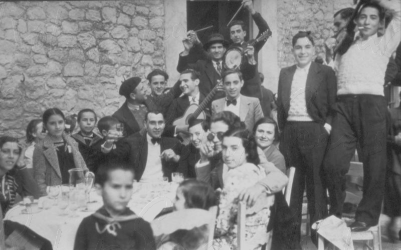 10 Group at Deyá cafe Gelat (with Solomon), Gordon Glover, ? Hat, Laura Riding, Honor Wyatt, Mary Philips, Kart Goldschmidt, Robert Graves. June 4, 1935
