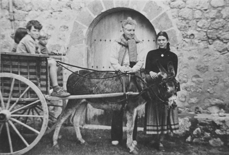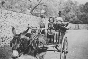 02 - 1951: William, Lucia, Juan, with Isabela the donkey. Deyá.