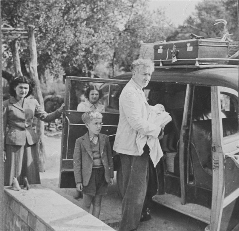 26 - 1953: Returning to Palma: Graves holding Tomas, with Francisca and Antonia Carrillo and Juan. Canellun.